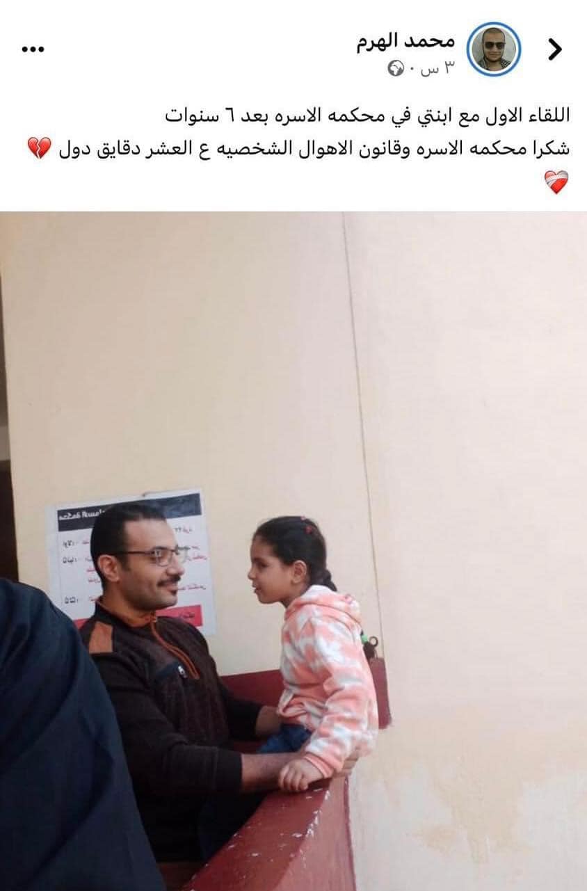 وكتب الأب أسفل الصورة "اللقاء الاول مع ابنتى فى محكمة الأسرة بعد 6 سنوات..شكرا قانون الأحوال الشخصية على الـ 10 دقائق دول".