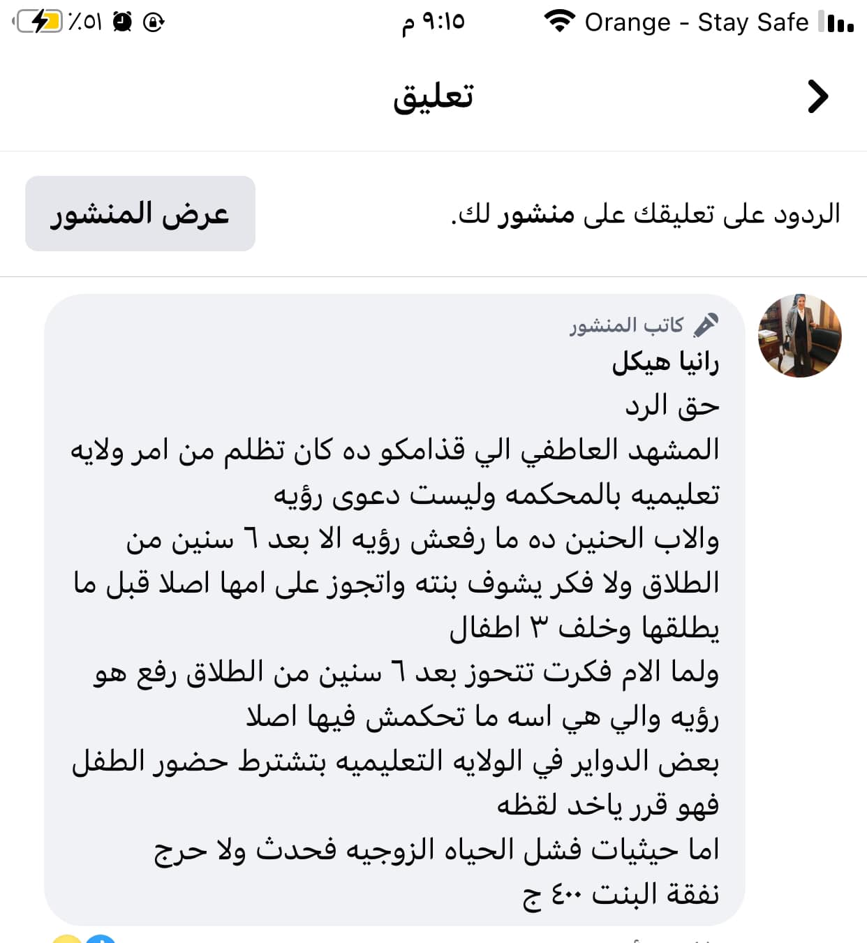 وبعد التضامن الكبير مع الأب، ظهرت رواية جديدة، حيث كتبت رانيا هيكل المشهد العاطفي اللي قدامكو ده كان تظلم من ولي أمر ولاية تعليمية وليست دعوى رؤية، والأب الحنين ده ما رفعش رؤية إلا بعد 6 سنوات من الطلا ولا فكر يشوف بنته واتجوز على أمها أصلا قبل ما يطلق وخلف 3 أطفال، ولما الأم فكرت تتجوز تاني بعد 6 سنين طلاق رفع هو رؤية واللي هو اصلا متحكمش فيها، بعض الدواير في الولاية التعليمية تشترط حضور الطفل فهو قرر ياخد اللقطة، أما حيثات فشل الحياة الزوجية فحدث ولا حرج نفقة البنت 400 جنيه".
