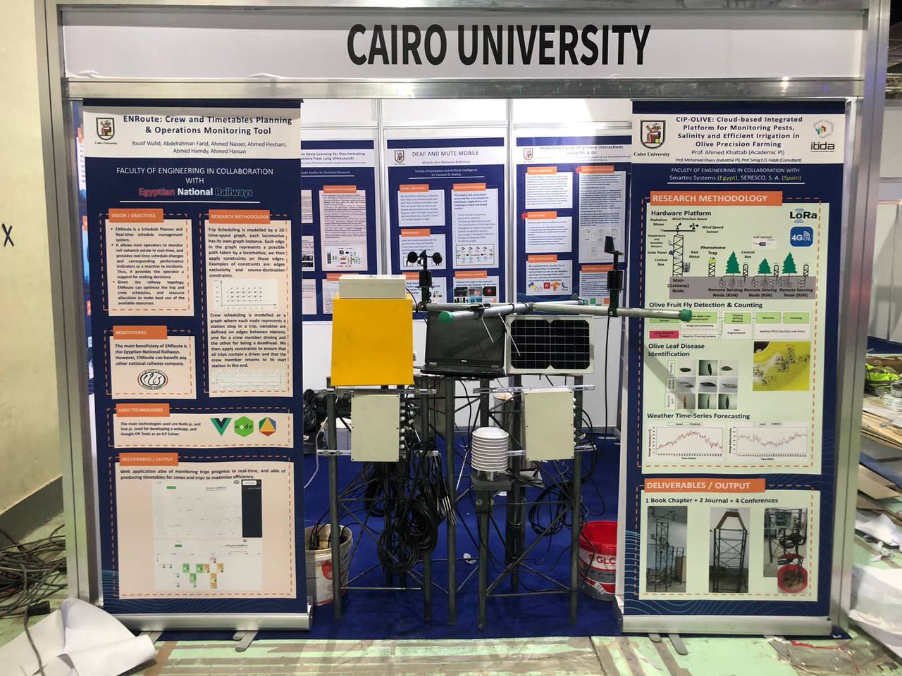 وأوضح الدكتور أحمد خطاب منسق جناح جامعة القاهرة بالمعرض والباحث الرئيسي لمشروع المنصة المتكاملة القائمة على السحابة الحسابية لمراقبة الآفات والملوحة والري الفعال في الزراعة الدقيقة للزيتون، أن المشروع المشارك يعد خطوة مهمة في الخطة الاستراتيجية المصرية الإسبانية لتمكين وتوطين صناعة الاتصالات وتكنولوجيا المعلومات لدعم الزراعة الذكية وزيادة إنتاجية محصول الزيتون حيث تعتبر مصر وأسبانيا أكبر دولتين في إنتاج وتصنيع الزيتون ومشتقاته، مشيرًا إلى أن النموذج الأولي للمنصة هو مخرج لمشروع بحثي ممول من البرنامج المصري الإسباني للابتكار في مجال تكنولوجيا المعلومات التابع لهيئة تنمية صناعة تكنولوجيا المعلومات (ايتيدا).