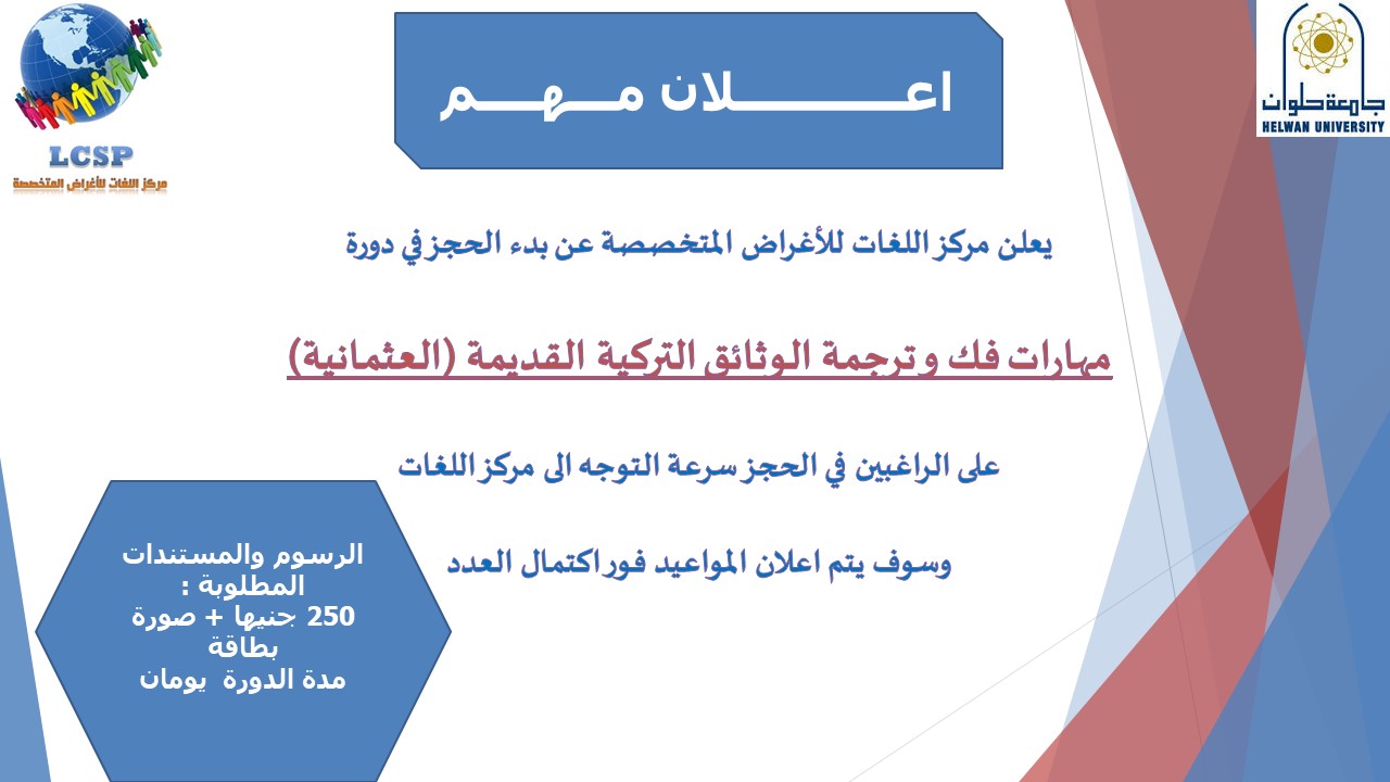 كما أعلن مركز اللغات للأغراض المتخصصة بكلية الآداب جامعة حلوان، تحت رعاية الدكتور السيد قنديل رئيس الجامعة، والدكتورة مها حسني عميد الكلية، وإشراف الدكتور شادي الكردي مدير المركز، عن بدء الحجز في دورة مهارات فك وترجمة الوثائق التركية القديمة (العثمانية).