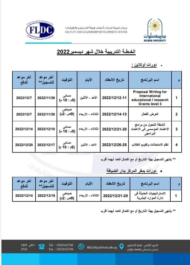 مركز تنمية قدرات جامعة حلوان يعلن عن خطته التدريبية لشهر ديسمبر