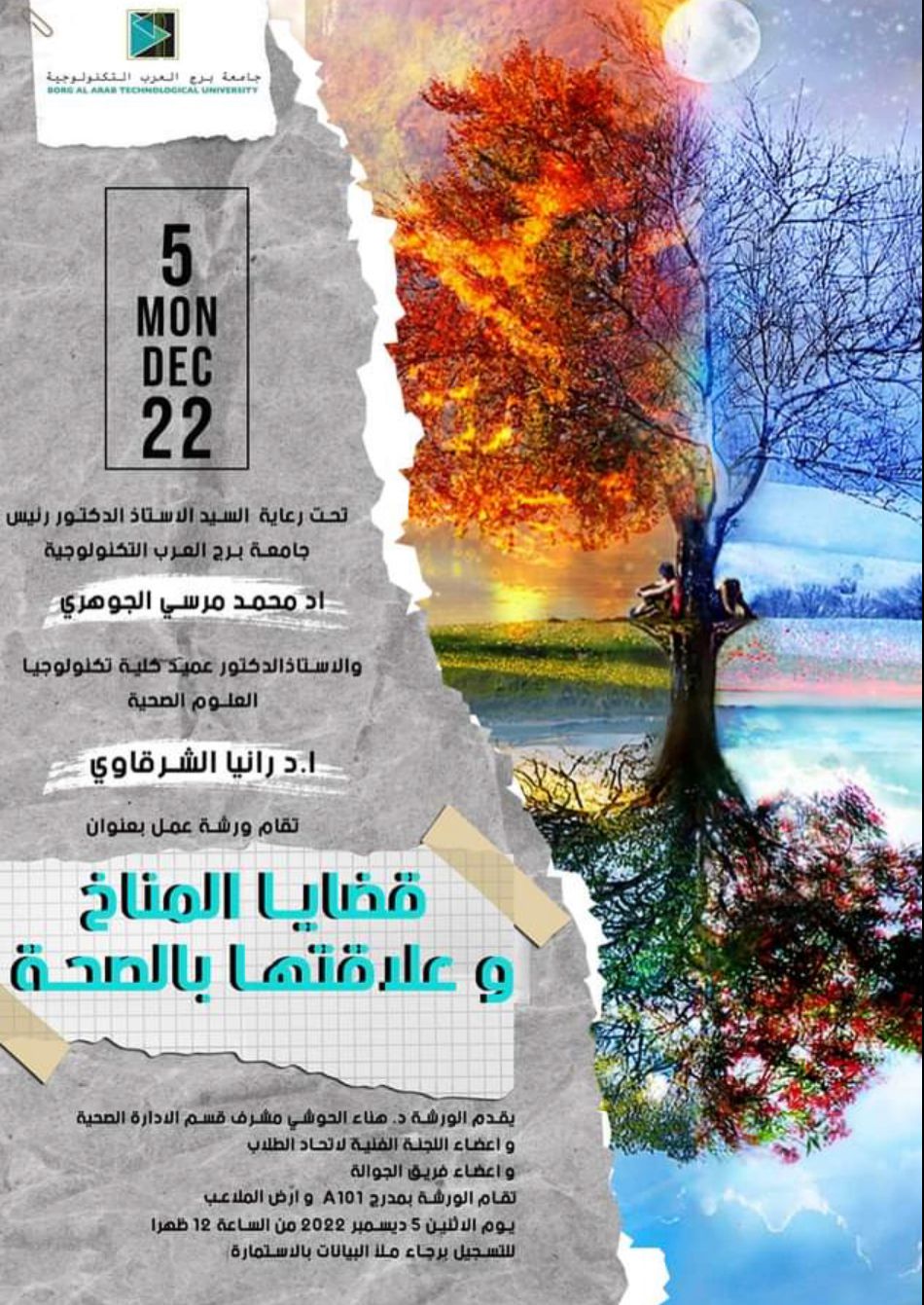 وتعقد جامعة برج العرب التكنولوجية، اليوم الاثنين ٥ ديسمبر، ورشة عمل، تحت عنوان "قضايا المناخ وعلاقتها بالصحة"، وذلك بكلية العلوم الصحية.