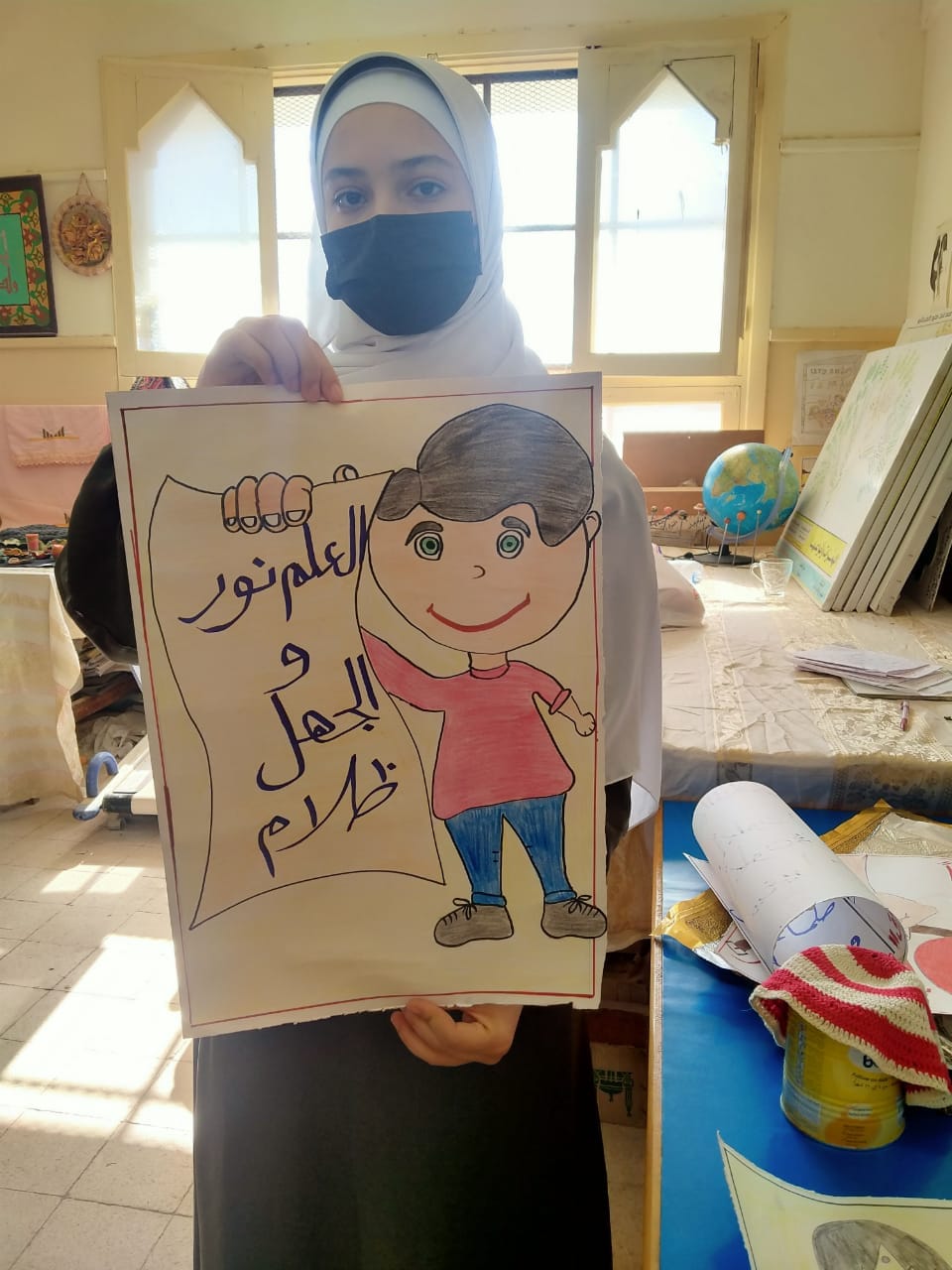 كما قدمن الفتيات لوحات فنية مكتوبة عليها، العلم نور والجهل ظلم، ومرسوم عليها فتاة تحمل تلك العبارة.