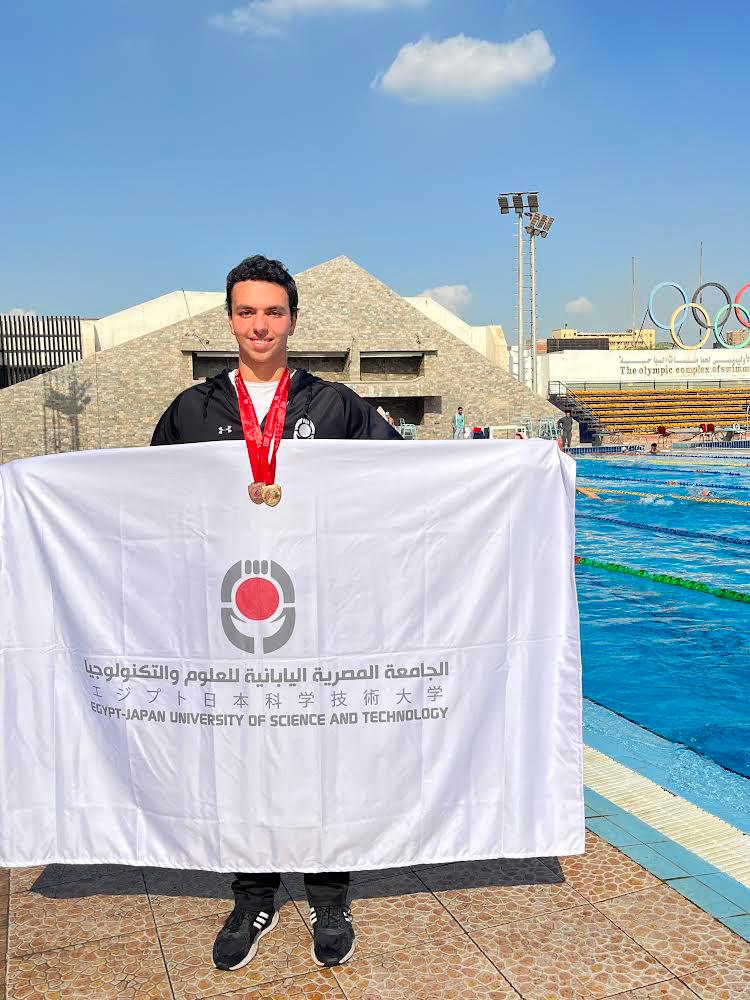 أعلن الدكتور حاتم محمود المشرف على الأنشطة الطلابية الجامعة المصرية اليابانية للعلوم والتكنولوجيا، عن حصاد الجامعة عدد 12 ميدالية منها ٥ ميداليات ذهب و٧ ميداليات برونزية، خلال مشاركتها بفعاليات بطولة الجامعات المصرية للسباحة وسباحة الزعانف حيث حصد الطالب حسن عصام هاشم بالفرقة الثانية بكلية هندسة على المركز الأول 50 متر مونو تحت الماء، والمركز الثالث 50 متر مونو، كما حصدت الطالبة جودي شريف الماس بالفرقة الأولى بكلية إدارة أعمال على المركز الأول 50 متر مونو تحت الماء، والمركز الأول 100 متر مونو، وحصدت الطالبة هنا عمرو محمد بالفرقة الأولى بكلية صيدلة على المركز الثالث 200 متر مونو.