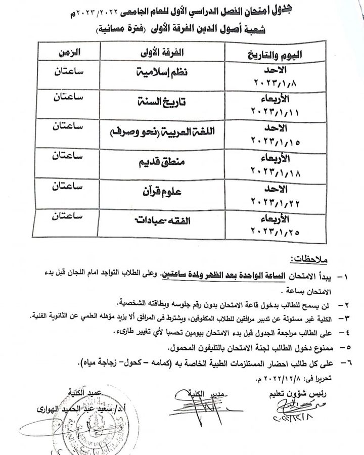 وتبدا الامتحانات في الخامس من شهر يناير المقبل لجميع الفرق والشُعب المسجلين في الكلية خلال العام الدراسي الحالي، وتنتهي في الحادى والعشرون من شهر يناير المقبل.