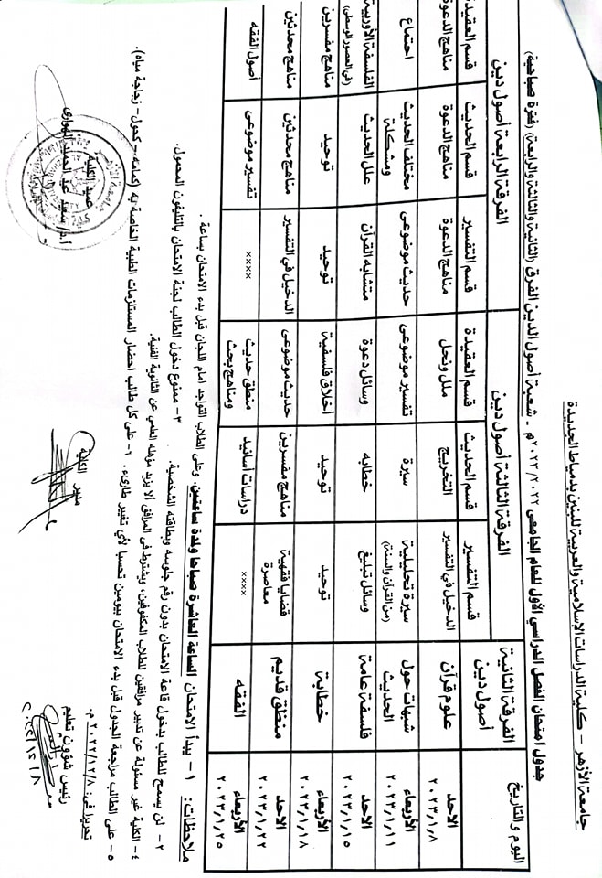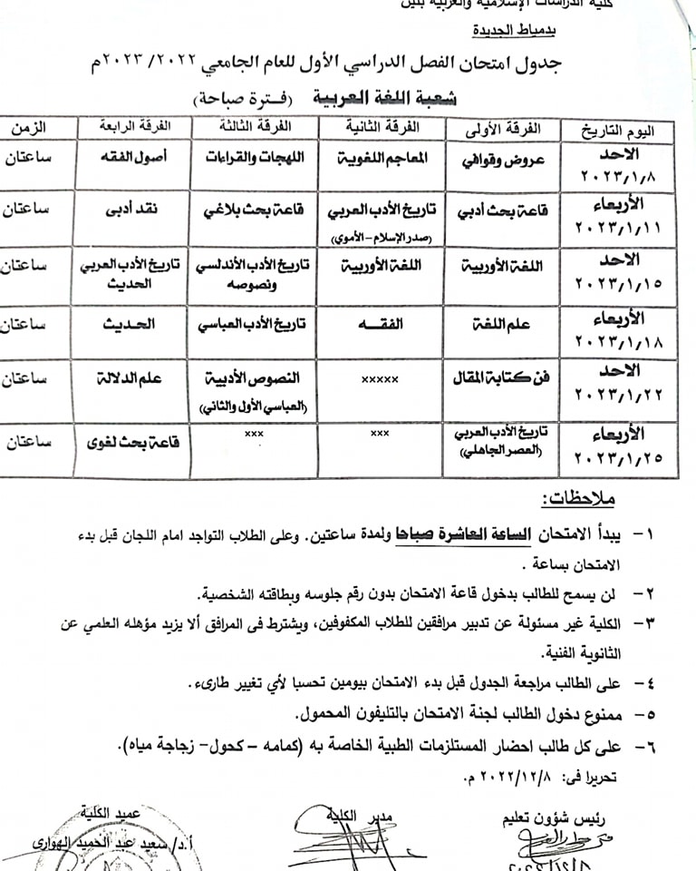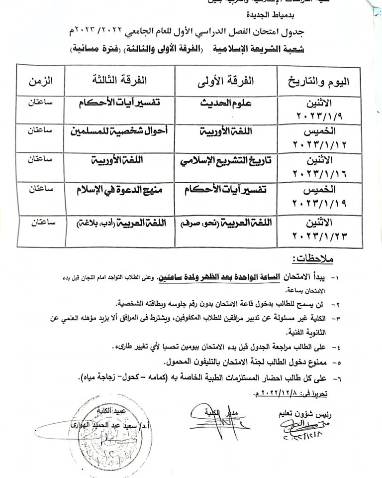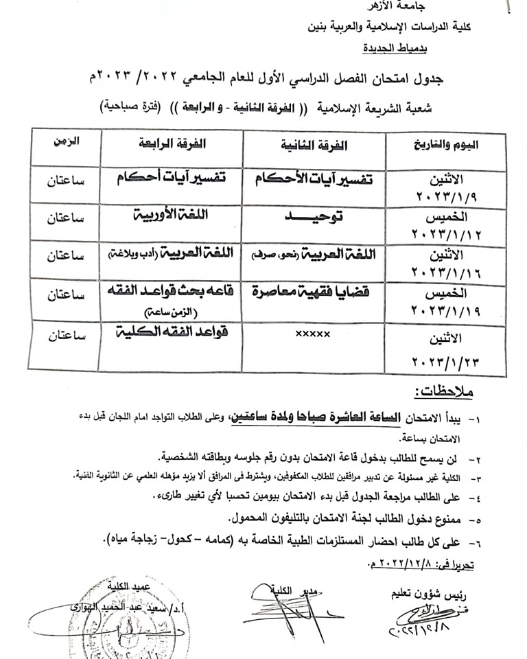 أعلنت كلية الدراسات الإسلامية والعربية بنين بجامعة الأزهر فرع دمياط، جدول امتحانات امتحانات الفصل الدراسي الأول للعام الجامعي الحالي.