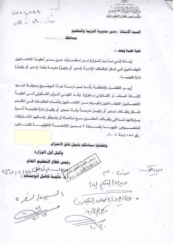 أكدت وزارة التربية والتعليم علي أحقية الأخصائيين الاجتماعيين وغيرهم من الأخصائيين وأمناء المكتبات في التقدم لشغل وظائف مدير ووكيل مدرسة.