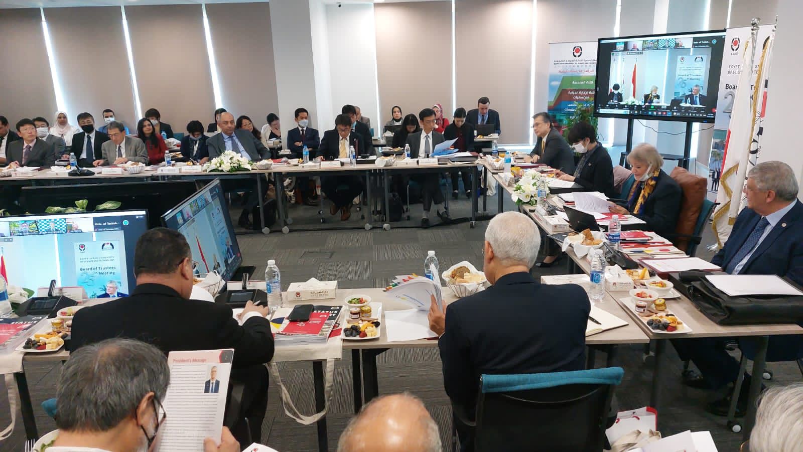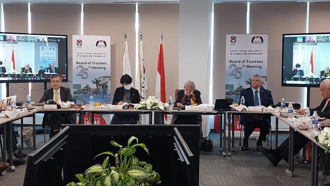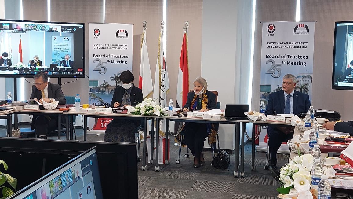 جاء ذلك خلال اجتماع ومجلس أمناء الجامعة المصرية اليابانية للعلوم والتكنولوجيا، في دورته الخامسة والعشرين بمقر الجامعة بالقرية الذكية برئاسة السفيرة فايزة أبو النجا وزيرة التعاون الدولي الأسبق، ومستشار رئيس الجمهورية للأمن القومي، بحضور الدكتور عمرو عدلي رئيس الجامعة، والسفير الياباني أوكا هيروشي، وساشيكو ايموتو نائب رئيس هيئة الجايكا اليابانية، والدكتور ماساكي سوزوكي نائب رئيس الجامعة لشئون العلاقات الإقليمية والدولية، والدكتور سامح ندا نائب رئيس الجامعة للتعليم والشئون الأكاديمية، والدكتور توشيو فوكودا نائب رئيس الجامعة للبحث العلمي، وأعضاء مجلس الأمناء من الجانبين المصري والياباني وعمداء الكليات والمراكز بالجامعة.