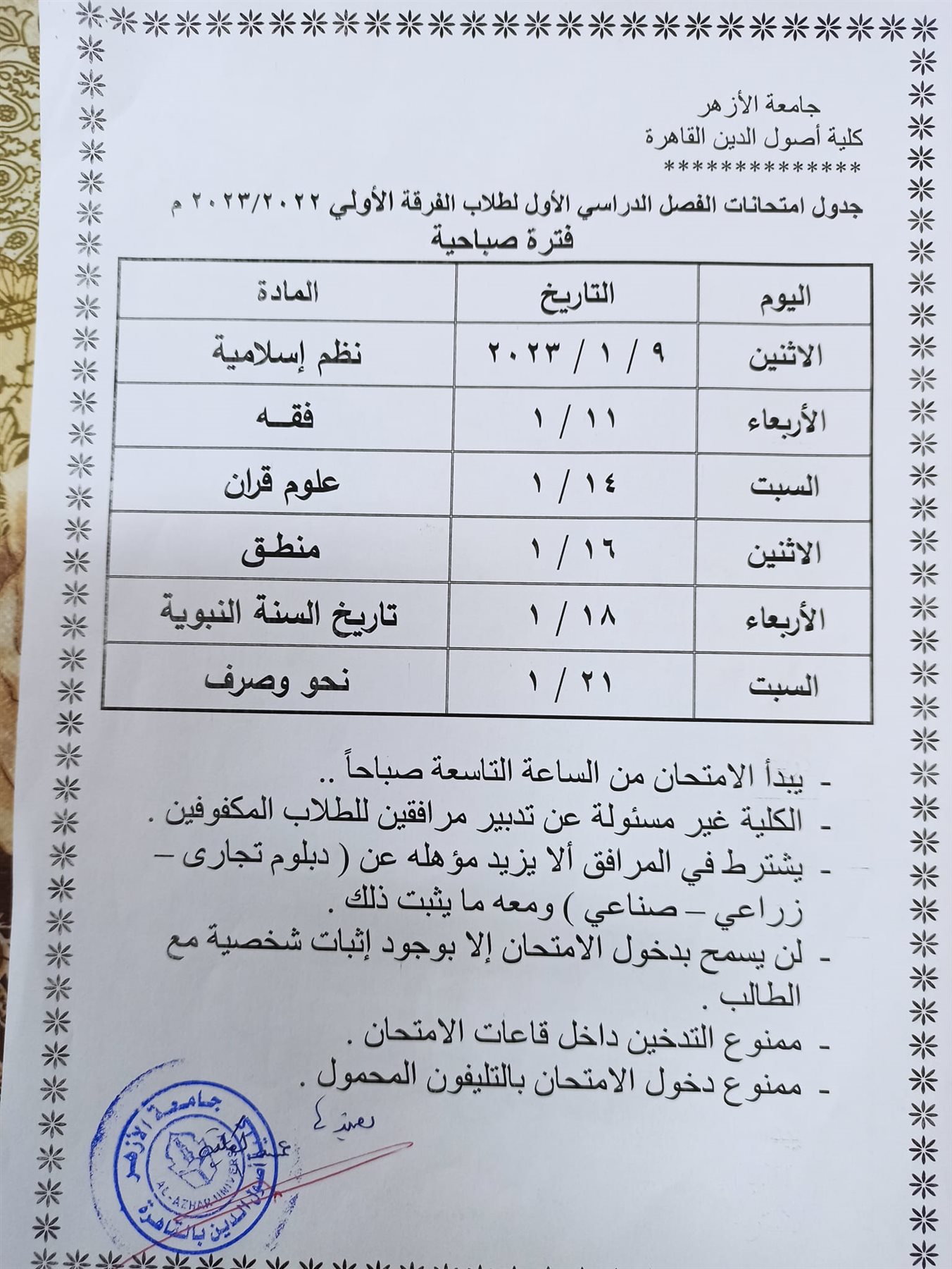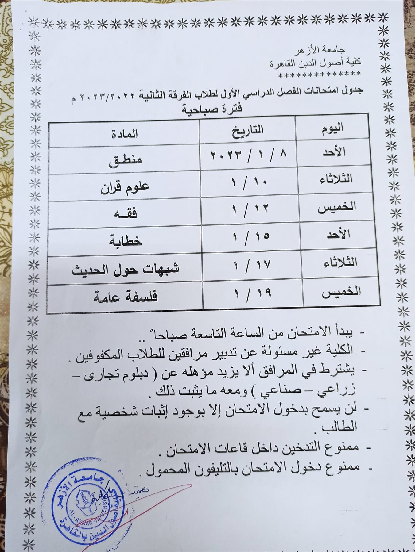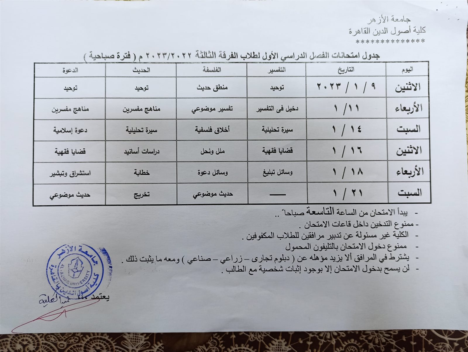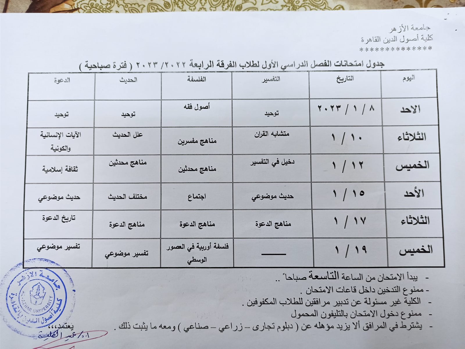 ننشر جداول امتحانات أصول الدين بالقاهرة الفصل الدراسي الأول