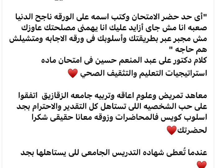 تداول رواد مواقع التواصل الاجتماعي، منشورا للدكتور عبدالمنعم حسين أستاذ مادة إستراتيجيات التعليم والتثقيف الصحي بمعهد التمريض جامعة الزقازيق، مخاطبا طلابه بشأن امتحانات الترم الأول من العام الجامعي الحالي 2022 – 2023.