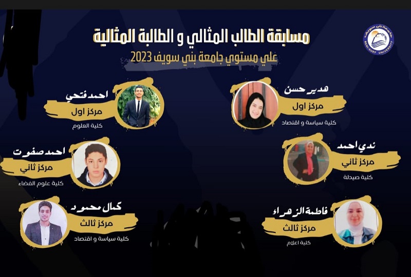 أعلن الدكتور منصور حسن رئيس جامعة بني سويف، نتيجة مسابقة الطالب المثالي والطالبة المثالية، للعام الدراسي 2022/2023م، والتي نظمتها إدارة رعاية الشباب بالجامعة، تحت إشراف الدكتور جمال عبدالرحمن نائب رئيس الجامعة لشئون التعليم والطلاب، ومحمد فاروق مدير عام رعاية الشباب، وأسفرت المسابقة عن فوز الطالب أحمد فتحي الفرقة الثالثة بكلية العلوم جامعة بني سويف، بالمركز الأول بمسابقة الطالب المثالي، فيما حصلت الطالبة هدير حسن بالفرقة الثالثة بكلية السياسة والاقتصاد جامعة بني سويف بالمركز الأول بمسابقة الطالبة المثالية على مستوى الجامعة.