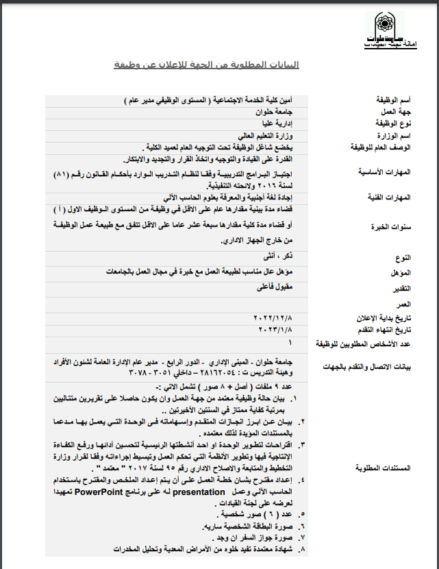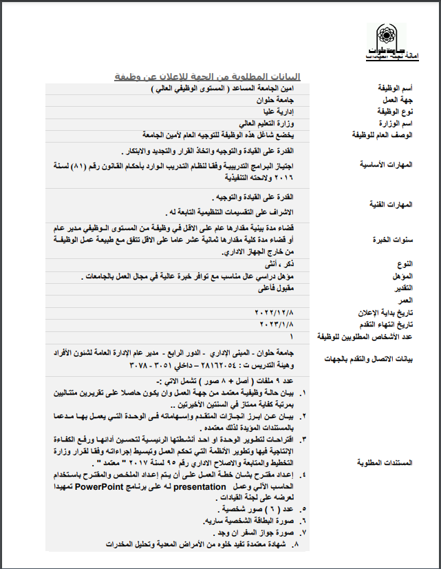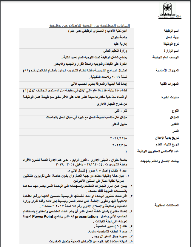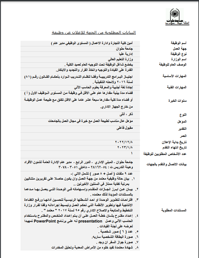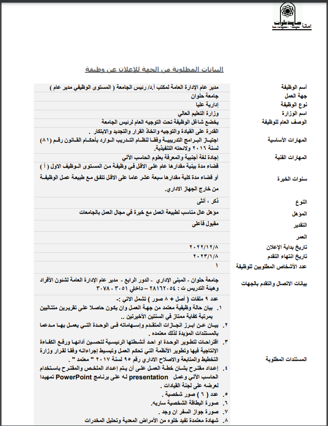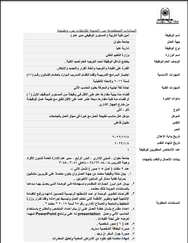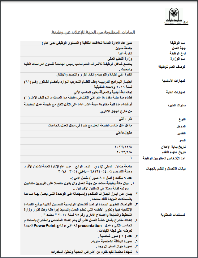 أعلنت جامعة حلوان عن وظائف قيادية شاغرة، لعدد 9 وظائف قيادية بدرجة مدير عام، وذلك لمدة شهر من تاريخ الإعلان بداية من يوم 2022/12/08 حتى يوم 2023/01/08، وتقدم طلبات التقديم للوظائف الشاغرة بالعنوان التالي: "جامعة حلوان - المبنى الإداري - الدور الرابع - مدير عام الإدارة العامة لشئون الأفراد وهيئة التدريس ت: 28162054 – داخلي 3051 - 3078".