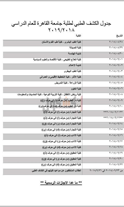 جامعات للطلاب الجدد..ننشر مواعيد الكشف الطبي بجامعة القاهرة إسراء جمال الأربعاء 15/أغسطس/2018 - 10:10 م 8/15/2018 10:10:00 PM طباعة ينشر موقع "كشكول" جدول الكشف الطبي لطلاب الجدد بجامعة القاهرة facebook twitter whats شارك