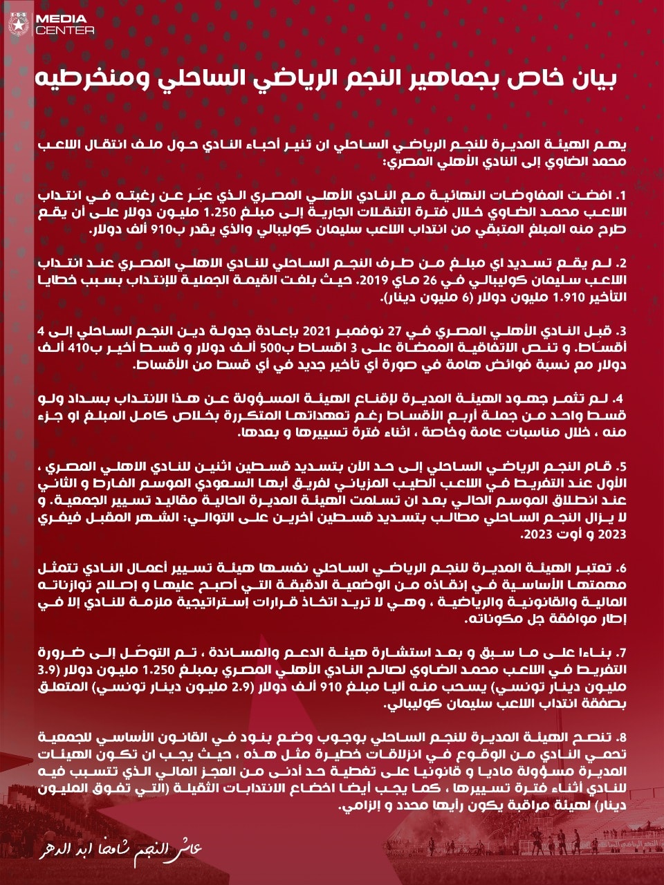 أصدر نادي النجم الساحلي التونسي بيانا رسميا لجماهيره لكشف تفاصيل انتقال لاعبه الشاب محمد الضاوي كريستو إلى النادي الأهلي.