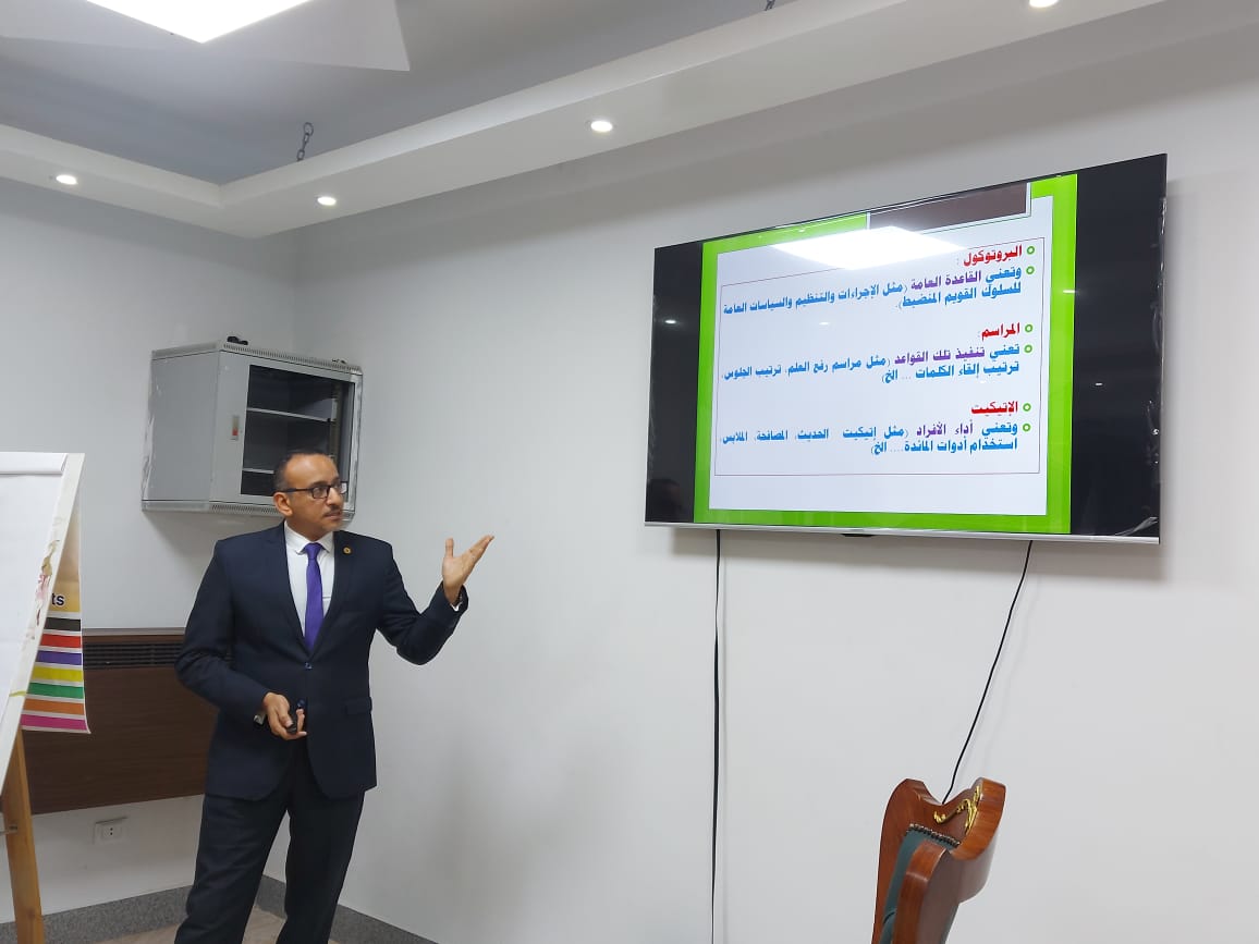 هذا وقد شهد اليوم الختامي فعاليات محاضرة فن الاتيكيت والبرتوكول والمراسم، والتي حاضر فيها الدكتور حسام الدين مصطفى الشريف وكيل معهد إعداد القادة، متناولا توضيح الفرق بين الإتيكيت والبرتوكول والمراسم، حيث أوضح أن البروتوكول يعد القاعدة العامة، بينما المراسم تعني تنفيذ تلك القواعد، والإتيكيت تعني أداء الأفراد، مبينا الأتيكيت جزء منه دراسة وجزء موهبة، متحدثًا عن نشأة فن الإتيكيت وبدايته، وتطرق إلي شرح اتيكيت التحدث مع المسؤولين، بجانب اتيكيت الاستماع والإنصات، وكذلك اتيكيت المجاملات الاجتماعية، وتوضيح اتيكيت الملابس، ثم اختتم المحاضرة بالحديث عن مراسم رفع العلم المصري، مبينا أشكال علم جمهورية مصر العربية.