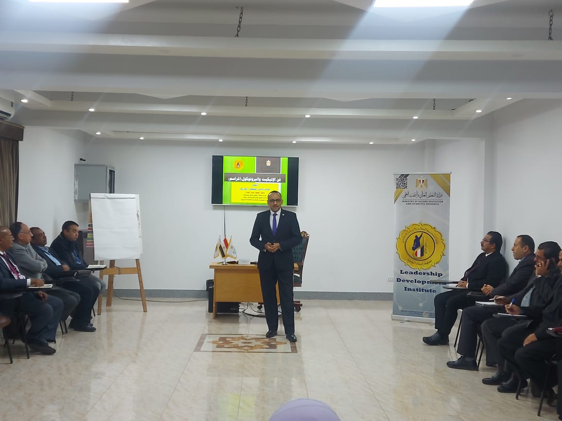 اختتم معهد إعداد القادة بوزارة التعليم العالي والبحث العلمي، فعاليات البرنامج التدريبى للسادة المرشحين من مجلس المراكز والمعاهد والهيئات البحثية بالوزارة لشغل منصب رؤساء المراكز البحثية، والذي عقد تحت رعاية الدكتور أيمن عاشور وزير التعليم العالي والبحث العلمي، وبقيادة الدكتور كريم همام مدير معهد إعداد القادة بالوزارة، وإشراف الدكتور حسام الدين مصطفى الشريف، والأستاذ الدكتور عبدالمنعم الجيلاني وكلاء المعهد، بمحاضرة عن فن الاتيكيت والمراسم والبروتوكول، وأخرى عن التوعية وأسس الأمن القومي.