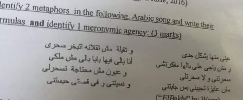 3- إختيار النصوص العربية داخل الإمتحان كان مبنياً على أساس التنوع ما بين الشعر الغنائى و العامة المصرية التى تقترب من الذوق العام للطلاب و التى تعتبر قريبة من سنهم