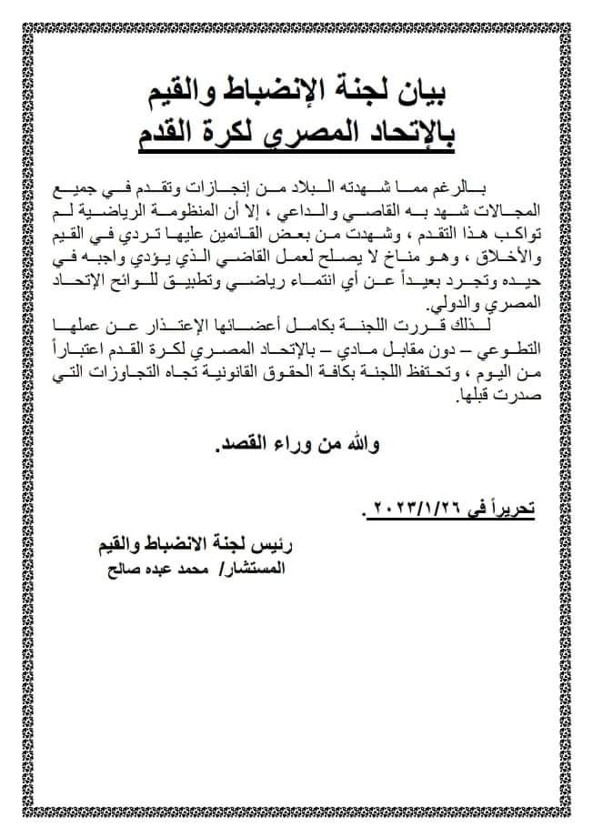 ونشرت اللجنة بيانا رسميا جاء على النحو التالي.. (بالرغم مما شهدته البلاد من إنجازات وتقدم في جميع المجالات شهد به القاصي والداعي، إلا أن المنظومة الرياضية لم تواكب هذا التقدم، لذلك قررت اللجنة بكامل أعضائها الاعتذار عن عملها التطوعي بدون مقابل مادي لاتحاد الكرة اعتبار من اليوم، وتختفظ اللجنة بكافة الحقوق القانونية تجاه التجاوزات التي صدرت في حقها.
