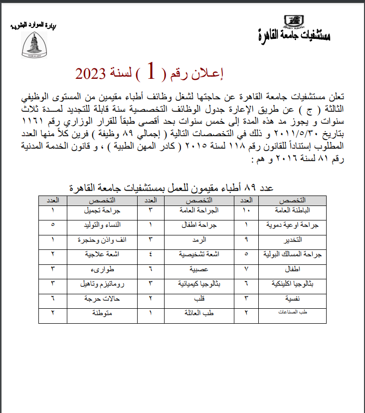 أعلن قسم المستشفيات جامعة القاهرة، عن وظائف شاغرة لأطباء مقيمين من المستوى الوظيفي الثالثة (ج) عن طريق الإعارة جدول الوظائف التخصصية سنة قابلة للتجديد لمدة ثلاث سنوات ويجوز مد هذه المدة إلى خمس سنوات بحد أقصى طبقًا للقرار الوزاري رقم 1161 بتاريخ 30/5/2011، وذلك لـ89 وظيفة طبيب مقيم للعمل بمستشفيات جامعة القاهرة، بداية من يوم 2023/01/25 حتى يوم 2023/02/08.