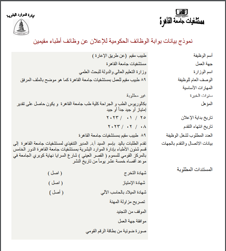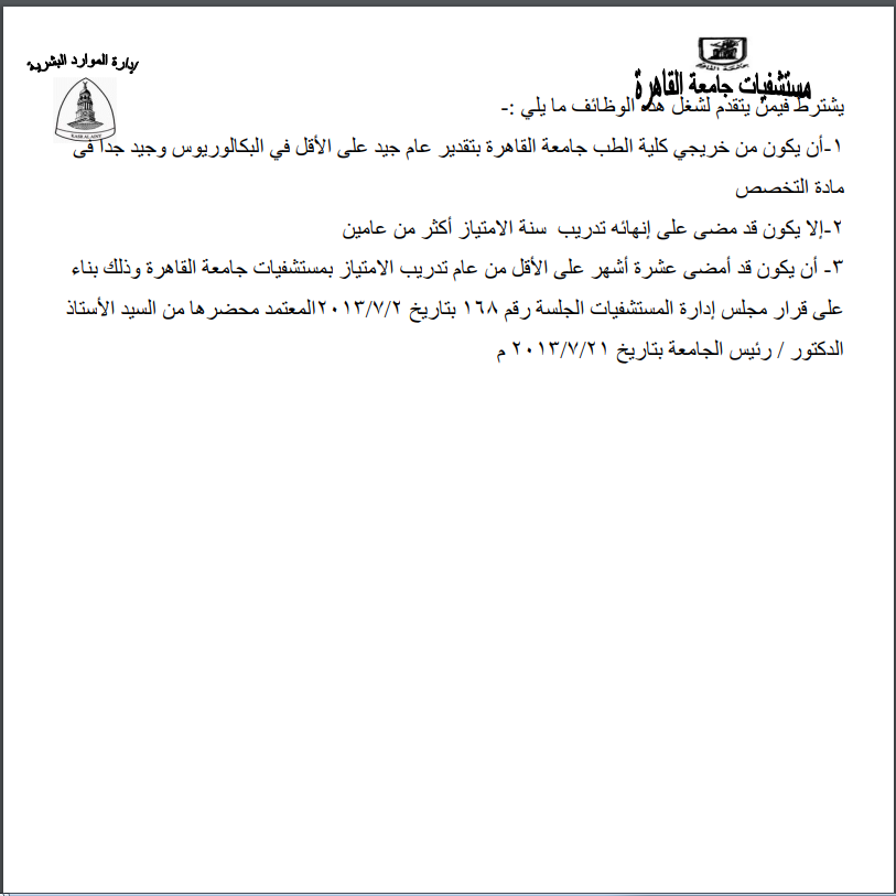 وأكد قسم المستشفيات جامعة القاهرة، أن يشترط فيمن يتقدم لشغل هذه الوظائف ما يلي: