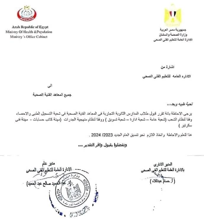 أرسلت الإدارة العامة للتعليم الفني الصحي بوزارة الصحة والسكان، إشارة إلى جميع المعاهد الفنية الصحية بشأن قبول طلاب المدارس الثانوية التجارية في المعاهد الفنية الصحية بالعام الدراسي المقبل 2023/2024.