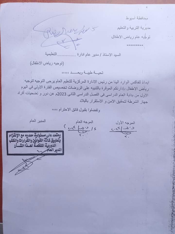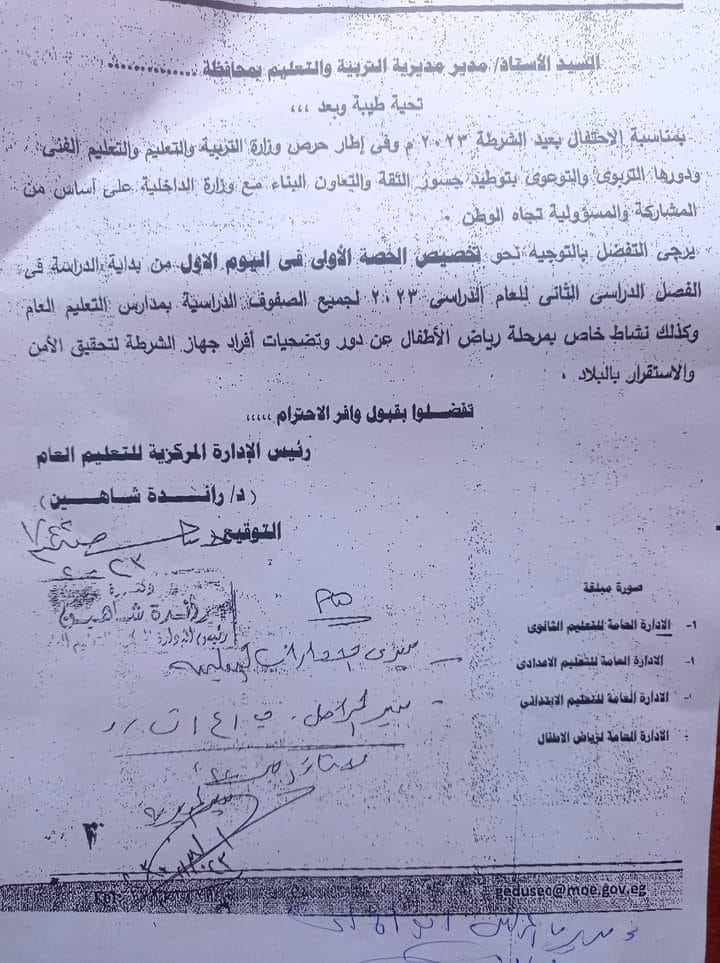 كما أرسلت فاكس لتوجيه رياض الأطفال بضرورة التنبيه على الروضات بتخصيص الفترة الأولى في اليوم الأول من بداية الفصل الدراسي الثاني 2023 عن دور وتضحيات أفراد جهاز الشرطة لتحقيق الآمن والاستقرار بالبلاد.