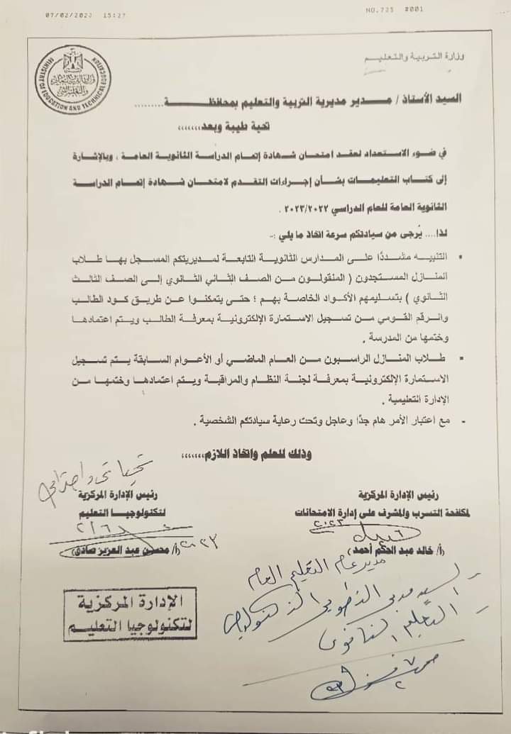 أرسلت وزارة التربية والتعليم والتعليم الفني، خطاب للمديريات التعليمية بجميع محافظات الجمهورية، في ضوء الاستعداد لعقد امتحان شهادة إتمام الدراسة الثانوية العامة، وبشأن إجراءات التقدم لامتحان شهادة إتمام الدراسة