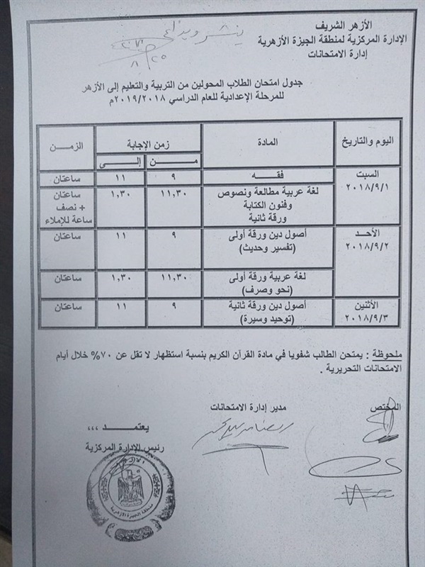 جدول امتحانات الطلاب المحولين من التربية والتعليم إلى الأزهر