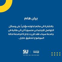وذكرت جامعة سيناء، أنه بالإشارة إلى ما تم تداوله مؤخرا على وسائل التواصل الاجتماعي منسوبا إلى طالبة في جامعة سيناء فقد قررت إدارة الجامعة إحالة الموضوع لتحقيق عاجل.