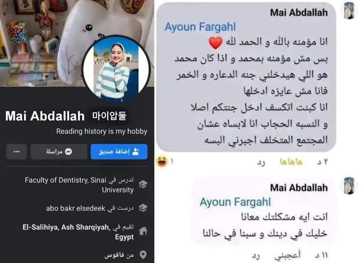 نشرت فتاة تدعى "م. ع" عبر صفحتها على موقع التواصل الاجتماعي فيسبوك منشورات ترفض فيها الاعتراف بسيدنا محمد صلى الله عليه وسلم تضمنت كلمات مسيئة للرسول والجنة.