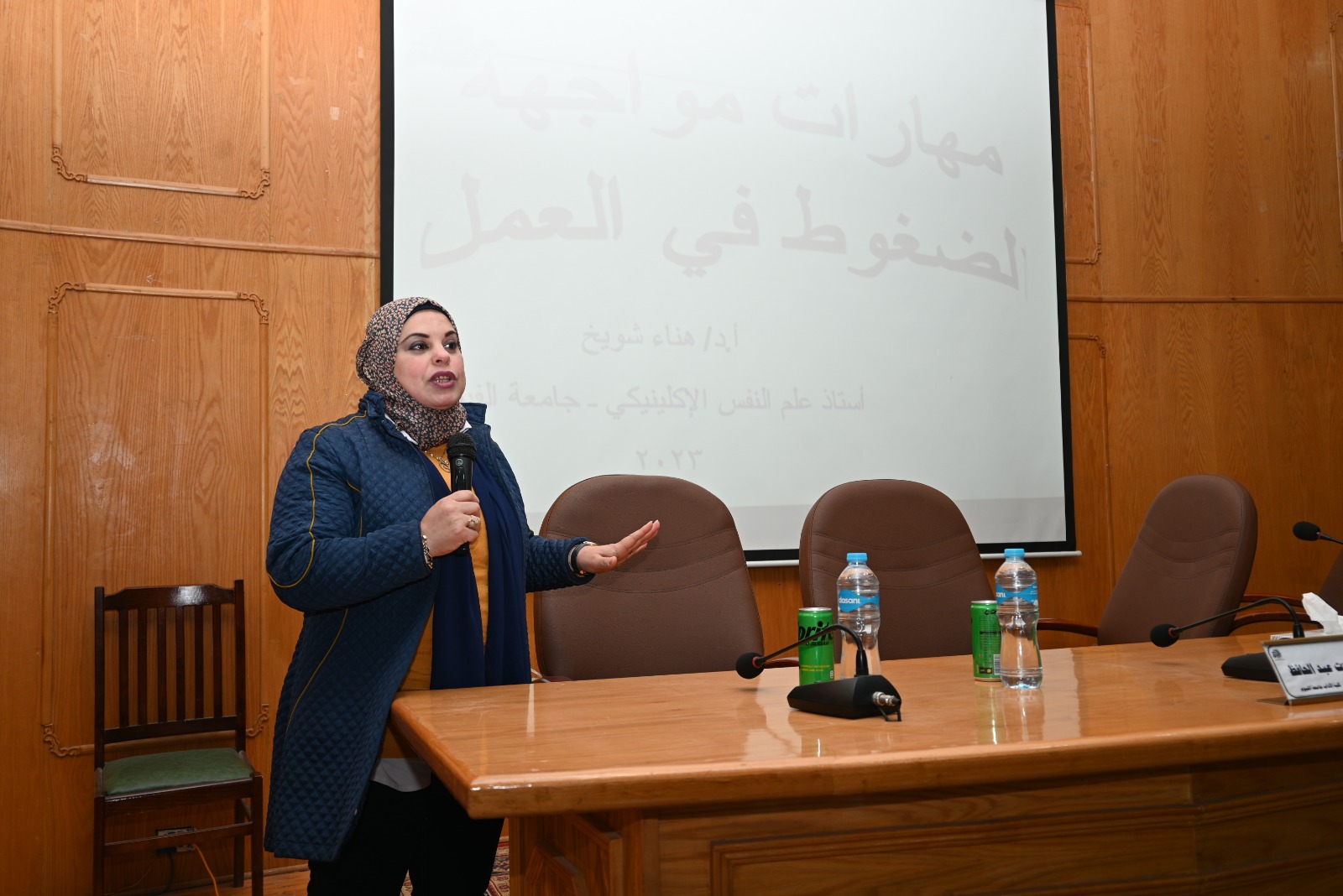 وتناولت الدكتورة هناء شويخ، الأستاذ بقسم علم النفس بكلية الآداب، الحديث حول مهارات مواجهة الضغوط في العمل، وأوضحت أن مسببات الضغوط متعددة، كما أشارت إلى اختلاف قدرات الأفراد في إدراك الضغوط والتفاعل معها.