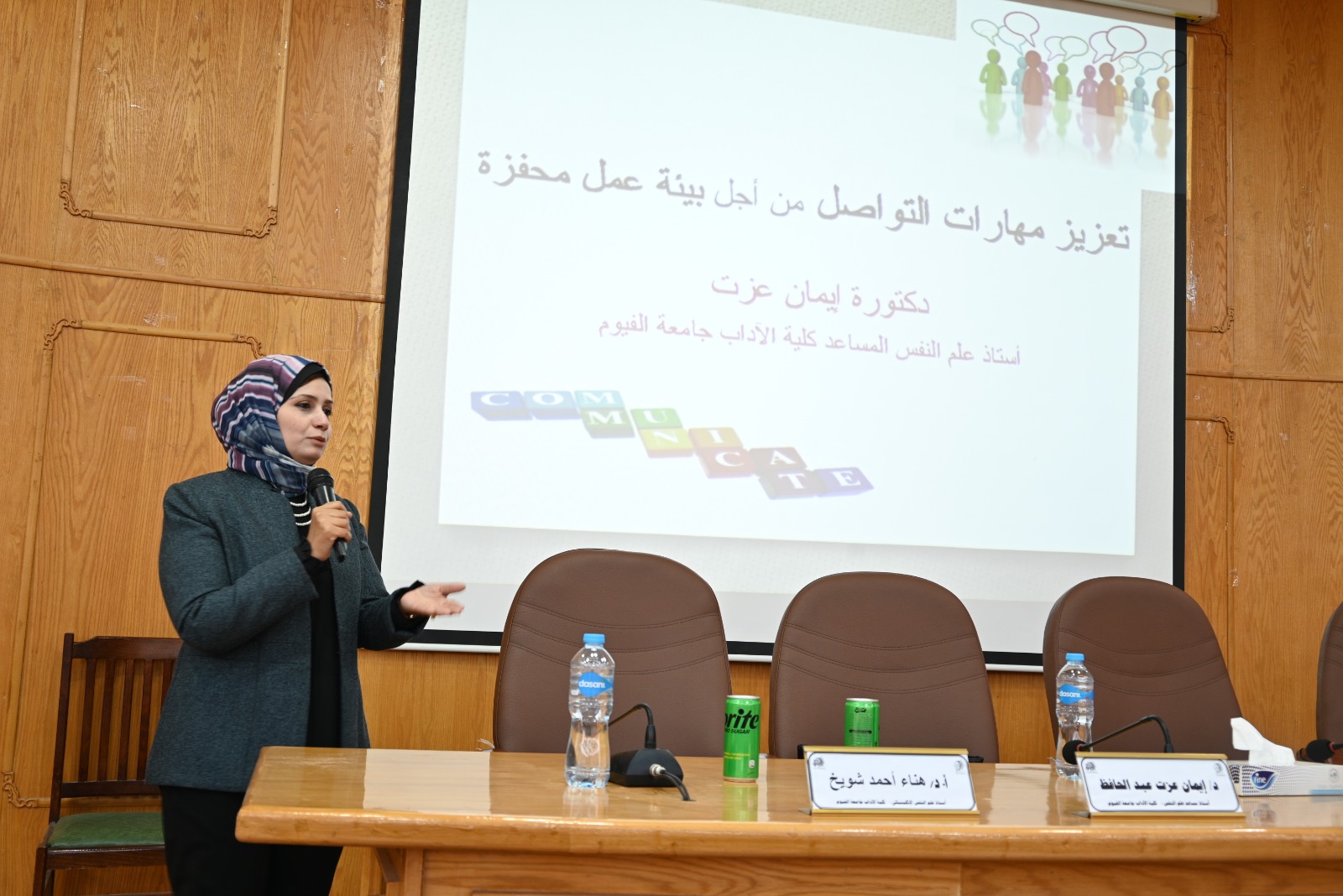 وتطرقت الدكتورة إيمان عزت، أستاذ مساعد بقسم علم النفس بكلية الآداب، إلى الحديث حول تعزيز مهارات التواصل من أجل بيئة محفزة للعمل، وشرحت مفهوم التواصل، وهو عبارة عن نشاط إنساني يهدف لتبادل الأفكار والمشاعر والمعلومات.