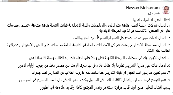 أوضح حسن محرم مستشار مادة الأحياء بوزارة التربية والتعليم الأسبق، أن افشال التعليم له أسباب أهمها الآتي: