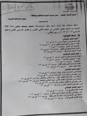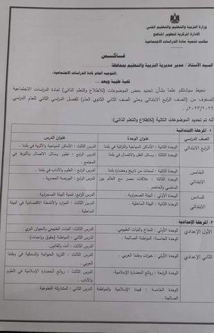 وجهت وزارة التربية والتعليم والتعليم الفني، خطاب مهم، لجميع مديريات التربية والتعليم على مستوى الجمهورية بشأن تحديد بعض الموضوعات للإطلاع للمواد الدراسية من الصف الثاني الابتدائي وحتى الثاني الثانوي خلال الفصل الدراسي الثاني ٢٠٢٣.