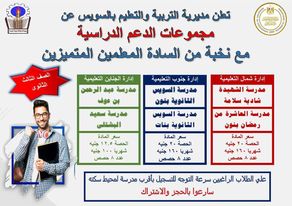 أعلنت مديرية التربية والتعليم بالسويس خبر سار لجميع أولياء الأمور حيث أعلنت عن بدء مجموعات الدعم المدرسية بمبلغ مالي قليل يبدأ من ١٢ جنيه في الحصة الواحدة و١٠٠ جنيه في الشهر.