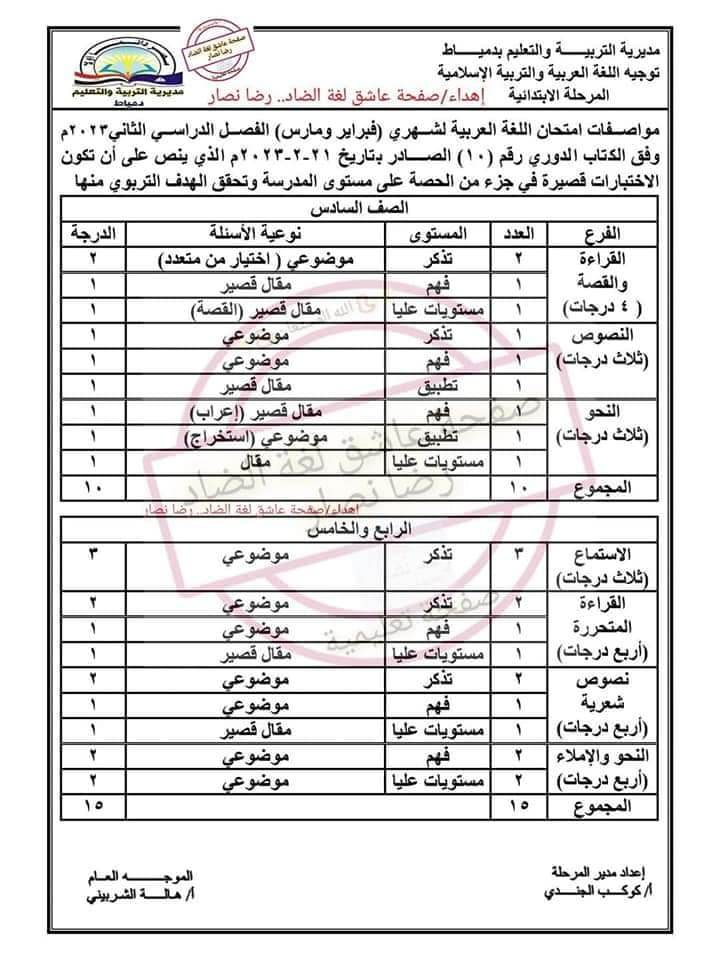 مواصفات امتحان اللغة العربية للصفوف الرابع والخامس والسادس الابتدائي