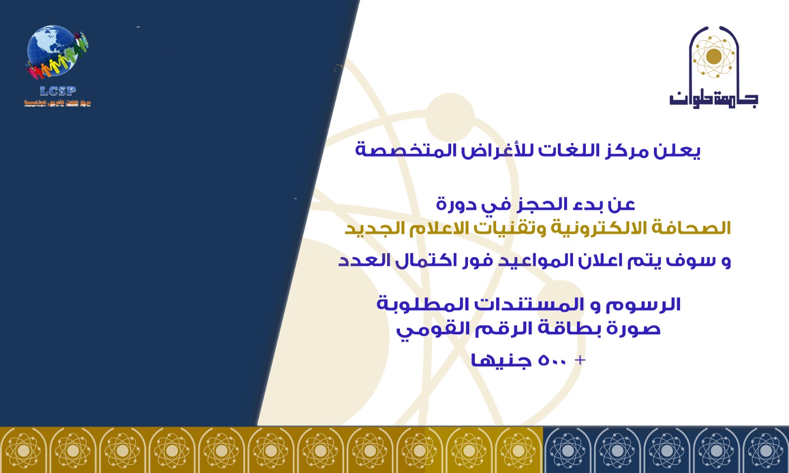 كما أعلن مركز اللغات للأغراض المتخصصة بكلية الآداب جامعة حلوان، عن فتح باب الحجز في دورة الصحافة الإلكترونية وتقنيات الإعلام الجديد.