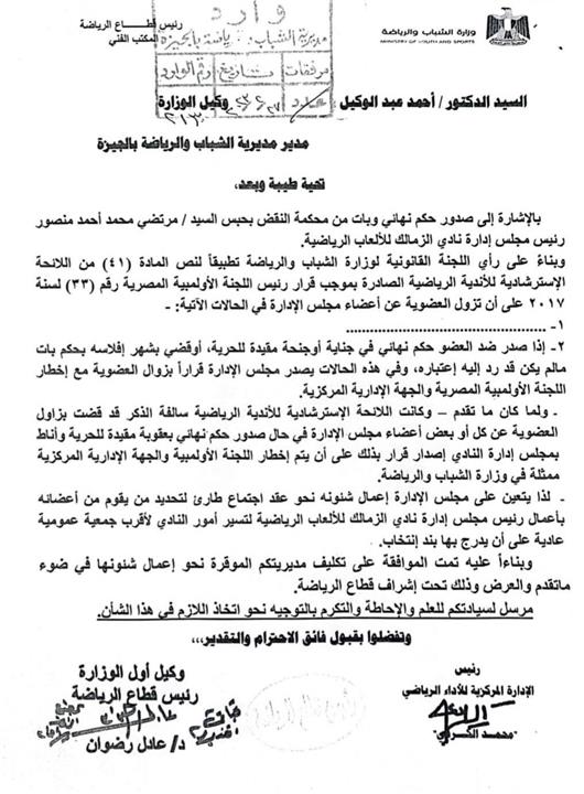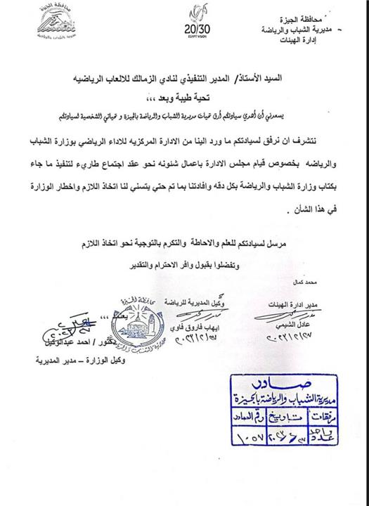 وطالبت وزارة الشباب والرياضة نادي الزمالك في خطابها الرسمي مجلس إدارة القلعة البيضاء بعقد اجتماع طارئ لتحديد من يقوم من أعضائه بأعمال رئيس مجلس الإدارة، لتسيير الأمور حتى أقرب جمعية عمومية عادية على أن يدرج بها بند انتخاب.