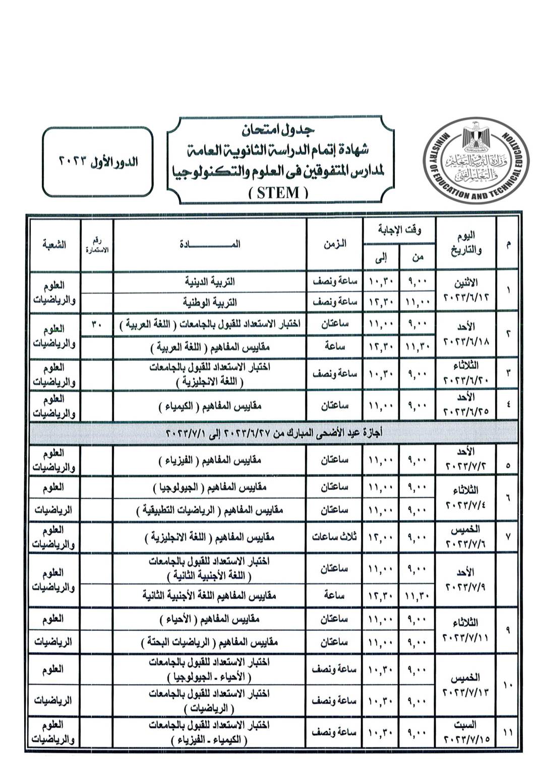 اعتمد الدكتور رضا حجازي وزير التربية والتعليم والتعليم الفني، جدول امتحانات الدور الأول لشهادة إتمام الدراسة الثانوية العامة للعام الدراسي 2023/2022، وجدول امتحانات مدارس المتفوقين في العلوم والتكنولوجيا "STEM"، وجدول امتحانات شهادة إتمام الدراسة الثانوية العامة للمكفوفين.