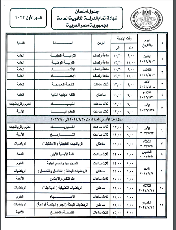 _ الاثنين 12 يونيو 2023 من الساعة التاسعة صباحًا حتى العاشرة والنصف امتحان التربية الدينية، ومن الساعة 11 حتى 12:30 امتحان التربية الوطنية