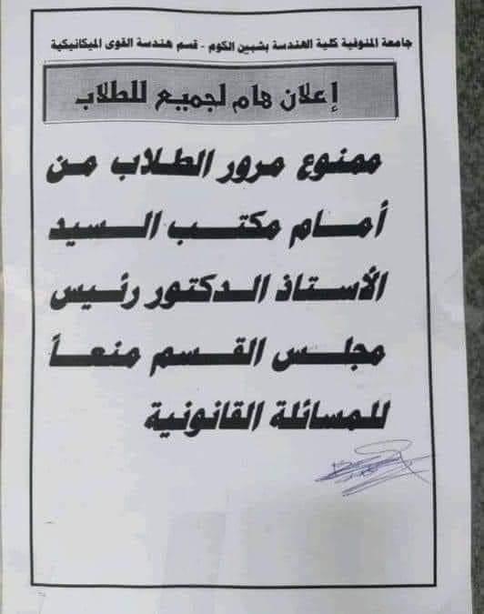 قرر الدكتور أحمد فرج القاصد رئيس جامعة المنوفية، إحالة واقعة منشور رئيس قسم هندسة القوى الميكانيكية بكلية الهندسة في جامعة المنوفية، بمنعه الطلاب المرور أمام باب القسم، إلى التحقيق لبيان حقيقة الأمر، عقب تداول المنشور علي نطاق واسع من طلاب هندسة والمواطنين على مواقع التواصل الاجتماعى.