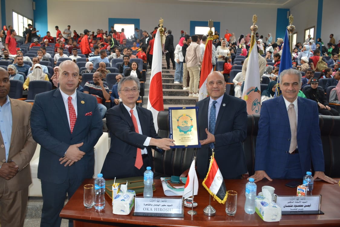 وفي ختام فاعليات الحفل قدم رئيس جامعة أسوان درع الجامعة للسفير الياباني تقديرًا لجهود السفارة في دعم قسم اللغة اليابانية كلية الألسن جامعة أسوان، وتعبيرًا عن التعاون الوثيق بين الجانبين.