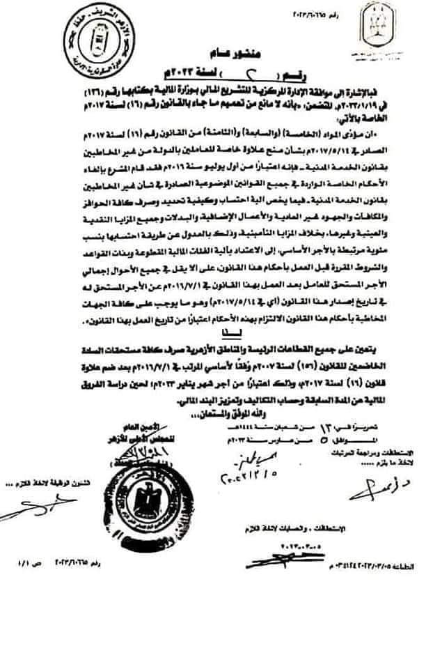 ويتعين على جميع القطاعات الرئيسة والمناطق الأزهرية صرف كافة مستحقات الخاضعين للقانون (15) لسنة ٢٠٠٧م وهذا الأساسي المرتب ٢٠١٦/٧/١م بعد ضم علاوة القانون (١٦) لسنة ۲۰۱۷م، وذلك اعتبارا من أجر شهر يناير 2023، لحين دراسة الفريق المالية من المدة السابقة وحساب التكاليف وتعزيز البند المالي.