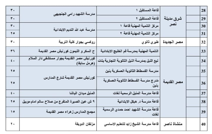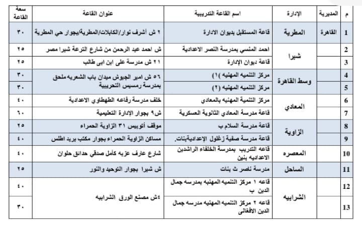 أعلنت مديرية التربية والتعليم والتعليم الفني بمحافظة القاهرة برئاسة أيمن موسى، أماكن قاعات تدريب المعلمين المستهدفين للتدريب ال٣٠ ألف معلم.
