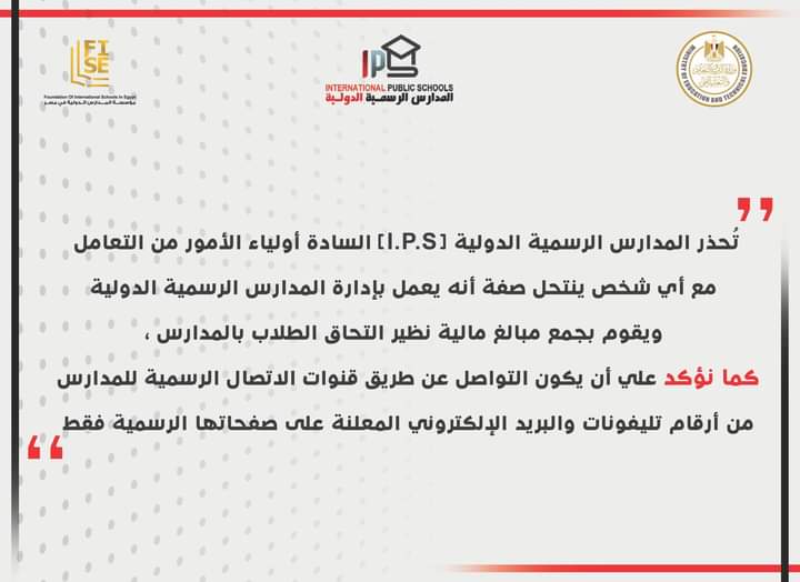 وجهت المدارس الرسمية الدولية [I.P.S] تحذير لأولياء الأمور من التعامل مع أي شخص ينتحل صفة أنه يعمل بإدارة المدارس الرسمية الدولية ويقوم بجمع مبالغ مالية نظير التحاق الطلاب بالمدارس.