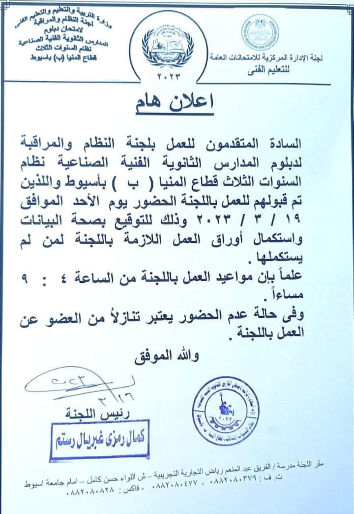 وجهت لجنة الإدارة المركزية للامتحانات العامة بالتعليم الفني، خطاب للمتقدمين للعمل بلجنة النظام والمراقبة لدبلوم المدارس الثانوية الفنية الصناعية قطاع المنيا "ب".