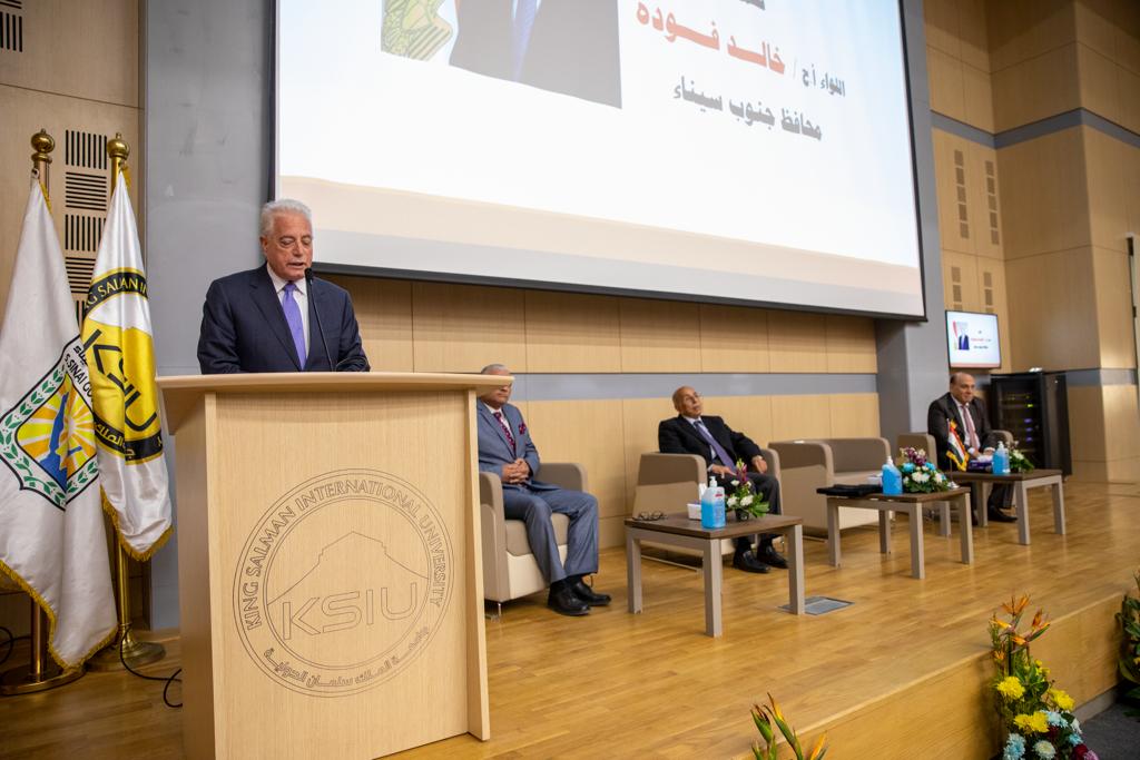 وفي كلمته، رحب رئيس جامعة الملك سلمان الدولية، بالحضور وقدم التهنئة لأهالي محافظة جنوب سيناء ولجميع الشعب المصري احتفالًا بالعيد القومي لمحافظة جنوب سيناء، مؤكدًا وجود تطور كبير تشهده المحافظة والجامعة من عام إلى عام، ومشيرًا إلى تنفيذ الدولة العديد من المشروعات القومية في مختلف المجالات وبجميع أنحاء الجمهورية.