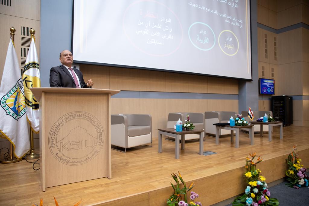 وألقى اللواء الدكتور سمير فرج، المفكر والخبير الاستراتيجي، محاضرة تحت عنوان "تحديات الأمن القومي المصري" وأكد فيها أن مصر هى الدولة الوحيدة التي نجحت في استرداد أرضها بالكامل عن طريق نصر أكتوبر ثم المفاوضات وبعد ذلك التحكيم الدولي لاسترداد طابا، واليوم تشهد سيناء مشروعات كبرى وتنمية غير مسبوقة، وأصبحت مصر دولة محورية كبرى تلعب دورًا مهمًا في المنطقة، خاصة وأن لديها علاقات قوية مع كافة دول العالم وتعمل على تعزيزها باستمرار لتحقيق المصلحة الوطنية.