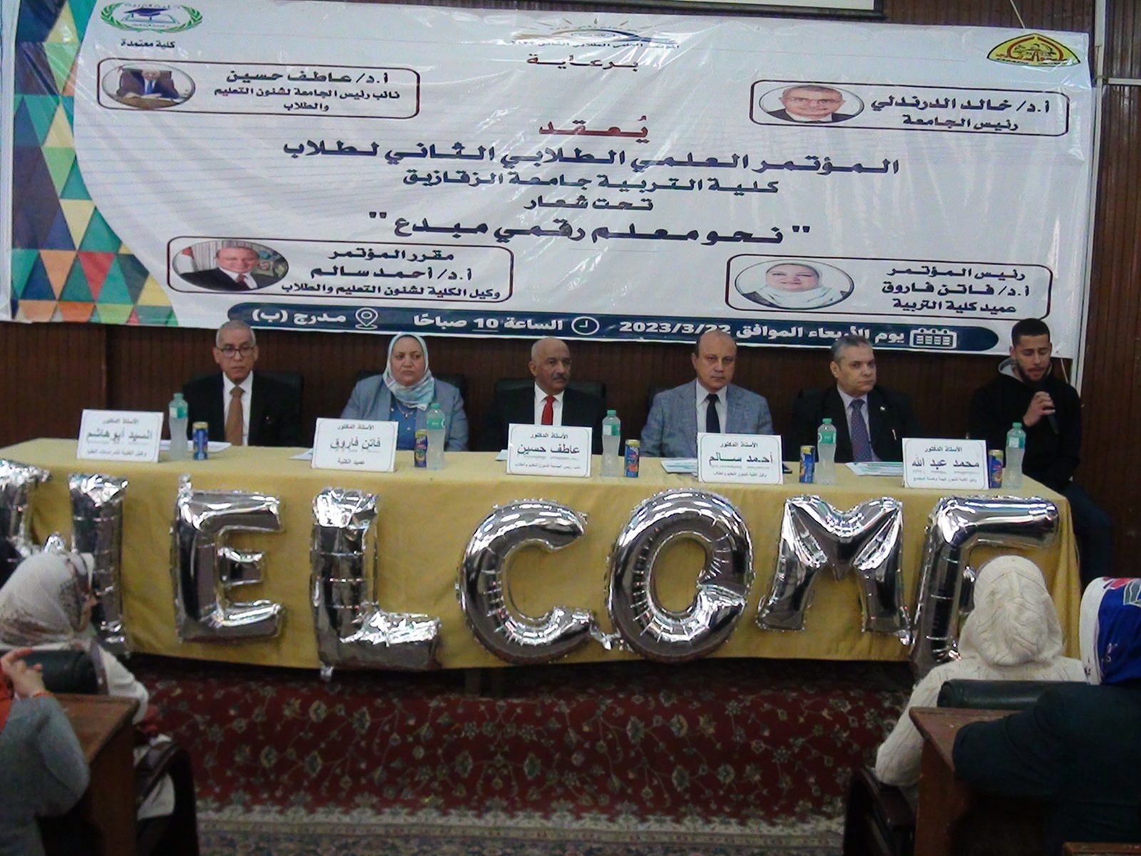 جاء ذلك بحضور الدكتورة فاتن فاروق عميد كلية التربية ورئيس المؤتمر، والدكتور أحمد سالم وكيل الكلية لشئون التعليم والطلاب ومقرر المؤتمر، والدكتور محمد الفقي وكيل الكلية لشئون خدمة المجتمع وتنمية البيئة ومدير وحدة محو الأمية وتعليم الكبار بالجامعة، والدكتور أحمد منصور مدير عام الكلية، ولفيف من أعضاء هيئة التدريس ومعاونيهم والطلاب بمختلف الفرق الدراسية والأقسام بالكلية.