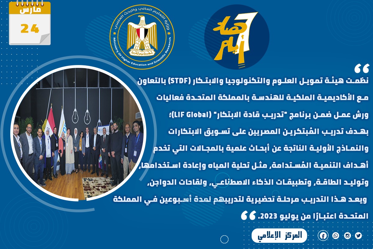 5) برعاية الدكتور أيمن عاشور وزير التعليم العالي والبحث العلمي، نظمت هيئة تمويل العلوم والتكنولوجيا والابتكار (STDF) بالتعاون مع الأكاديمية الملكية للهندسة بالمملكة المتحدة فعاليات ورش عمل ضمن برنامج "تدريب قادة الابتكار" (LIF Global)؛ بهدف تدريب المُبتكرين المصريين على تسويق الابتكارات والنماذج الأولية الناتجة عن أبحاث علمية بالمجالات التي تخدم أهداف التنمية المُستدامة، مثل تحلية المياه وإعادة استخدامها، وتوليد الطاقة، وتطبيقات الذكاء الاصطناعي، ولقاحات الدواجن،